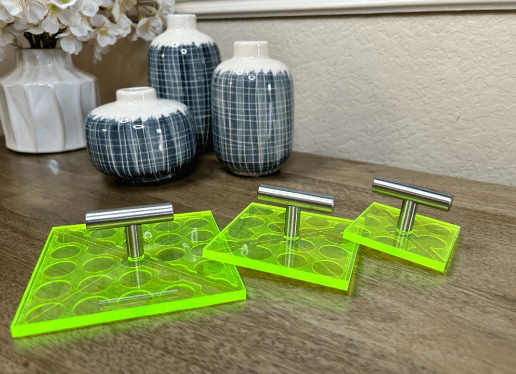 The Trim-Lock is meant to be used to cut 2.5″, 3.5″, and 4.5″ half square triangles, as well as for use in fussy cutting. The magic happens when you apply pressure to the handle, which engages the grippy material on the base of the Trim-Lock on your fabric, keeping your fabric in place so you can cut, and spin, your fabric without having to readjust your template for every cut.